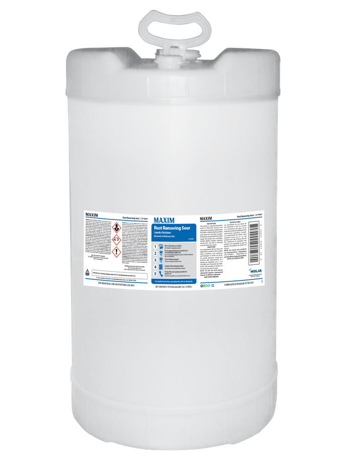 Formulated to neutralize alkaline residues and dissolve iron stains, this professional sour helps maintain the appearance of commercial linens by preventing graying and fading over repeated laundering.