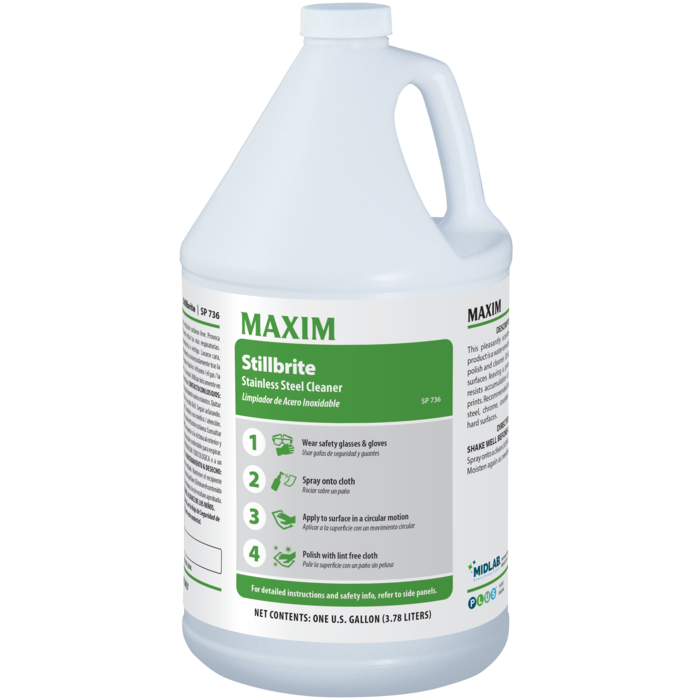 This pleasantly scented, ready-to-use stainless steel polish and cleaner is a water-based emulsion that quickly removes soils while leaving a protective gloss. It helps resist dust and fingerprints, and is ideal for stainless steel, chrome, countertops, and other hard surfaces.